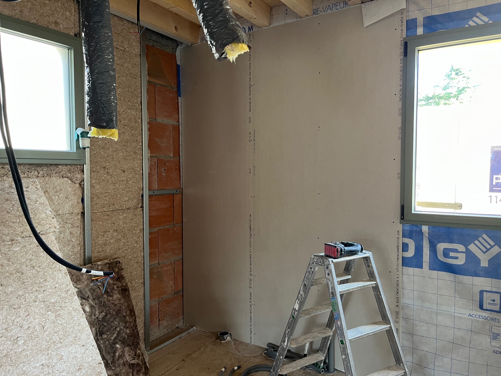 Isolation d’une maison neuve en laine biosourcée : chanvre, lin et coton (Biofib trio de chez Biofib) avec mise en place d’un pare vapeur SD20.