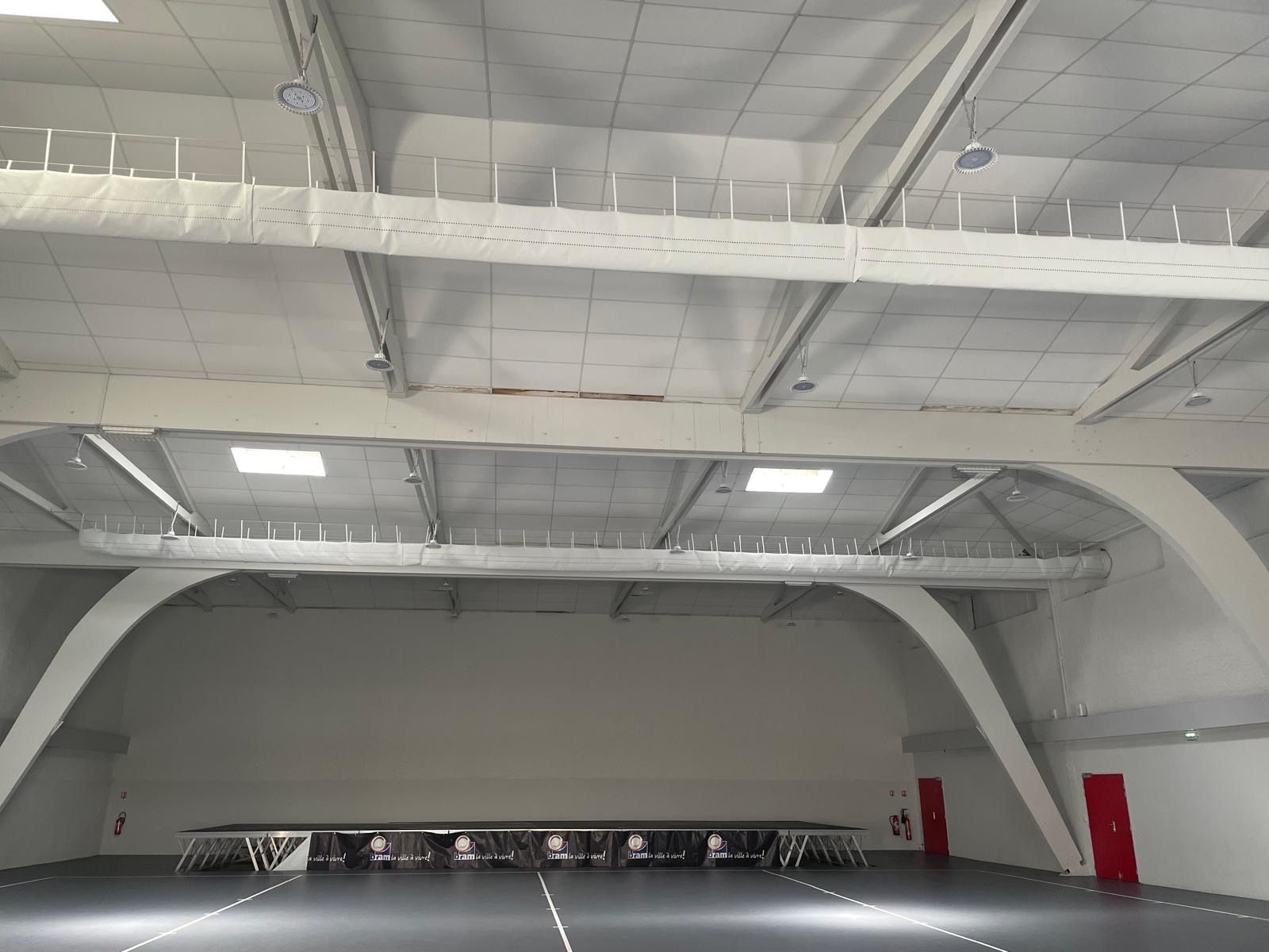 Réalisation d’un plafond thermo acoustique dans une salle des fêtes en dalles 1 200 x 600 modèle Perla Op1 de chez Armstrong.